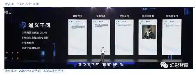 2022 年 9 月阿里发布最新“通义”大模型系列,其中通用模型层包含通义-M6、通义-AliceMind 和通义- CV 三类模型,覆盖多模态、自然语言处理、计算机视觉,专业模型层深入电商、医疗、法律、金融、 娱乐等行业。 2023 阿里云峰会召开,此次大会大规模语言模型(LLM)“通义千问”正式发布,成为第四个通用模型。 通义千问支持多轮交互及复杂指令理解、多模态融合以及外部增强 API,应用包括多轮对话、文案创作、 逻辑推理、多模态理解、多语言支持等。目前“通义千问”开启正式的限量邀请体验。