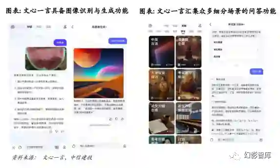 今年上半年百度文心大模型更新至 3.5 版本,年底将推出 4.0 版本。期待百度文心大模型持续迭代,并 在 AI 应用拓展道路上进行率先探索,预计中长期将对百度的核心竞争力做出贡献。 文心一言首日用户数破百万。据百度官网,8 月 31 日起,用户可在 APP 或登陆官网体验。据百度官方, 文心一言 APP 发布首日用户数突破 100 万。从体验来看,文心一言主要有以下特色功能/体验,有望提 高用户粘性: 1**)汇集众多细分场景的问答功能 在“发现”页面,文心一言就诸多场景提供特定任务的智能问答功能,如学习、情感、娱乐等,其中“学习” 内就可为用户提供翻译、大纲生成、复习助手等。 2)有社区生态与指令模板,降低使用门槛 **APP 端用户可分享与文心一言的对话,供其他用户查看,从而互相学习指令以获得灵感;网页端内, “一言百宝箱”提供各应用场景提供参考的指令。