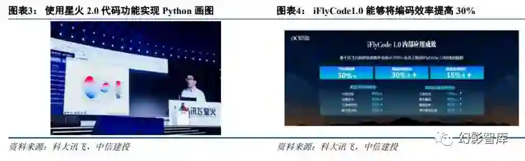 星火大模型 2.0 提升了代码编写过程中代码生成、代码补全、代码纠错和单元测试生成功能。在发布会 现场测试中,通过一句话编写代码,便可通过 python 编写贪吃蛇小游戏,代码生成能力性能卓越。讯 飞星火的代码生成和补齐能力已经超过了 ChatGPT,其他各项能力正在快速追赶。 公司也给出了代码能 力进步的明确目标,今年 10 月 24 日各个代码纬度能力都会超过 ChatGPT,明年上半年要对标 GPT4。 为了让研发人员更好的应用星火大模型的代码能力,同时发布了全新产品智能编程助手 iFlyCode1.0。 根据讯飞内部研发效能平台对 2000 余名员工在 1 个月内测试使用 iFlyCode1.0 的成效数据统计,代码 采纳率达 30%,编码效率提升 30%,综合效率提升 15%。