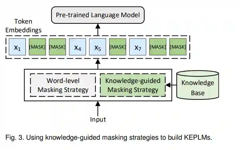 以BERT为代表的PLMs 通常使用维基百科等的非结构化文本文档作为预训练的语料库。非结构化文本数据包含丰富的上下文语义信息,BERT可以通过掩码语言模型(MLM)从中学习单词的上下文知识。然而,文本中同样包含有价值信息的实体和短语被忽略了。通过采用知识引导的超越单个单词层面的掩码策略,PLMs 能够融合实体、短语等知识,如图3所示。