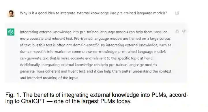 预训练语言模型(PLMs)首先在大型数据集上进行训练,然后直接迁移到下游任务,或在另一个小型数据集上进一步微调,以适应特定的NLP任务。早期的PLMs,如Skip-Gram[1]和GloVe[2],是浅层神经网络,其词嵌入(从窗口大小的上下文中学习)是静态语义向量,这使得它们无法处理动态环境下的一词多义问题。随着深度学习的发展,研究人员试图利用深度神经网络来通过动态语义嵌入来提高任务的性能。起初,人们仍然局限于监督学习的范式,认为没有足够的标记数据,很难释放深度学习的潜力。然而,随着自监督学习的出现,BERT[3]等大型语言模型可以通过预测事先被掩盖的标记,从大规模无标记文本数据中学习大量知识。因此,他们在许多下游NLP任务中取得了突破性进展。此后,许多大型模型开始采用Transformer[4]结构和自监督学习来解决NLP问题,plm逐渐进入快速发展阶段。PLMs最近的惊人成功是OpenAI的ChatGPT。随着研究的进展,人们发现PLMs仍然面临可解释性差、鲁棒性弱和缺乏推理能力的问题。具体来说,PLMs被广泛认为是黑盒,其决策过程是不透明的,因此很难解释。此外,PLMs可能不够鲁棒,因为深度神经模型容易受到对抗性样本的影响。此外,由于纯数据驱动,PLMs的推理能力也受到限制。PLMs的所有这些缺点都可以通过纳入外部知识来改善,这就产生了所谓的知识增强的预训练语言模型(KEPLMs)。图1用ChatGPT的话说就是KEPLMs的优势。