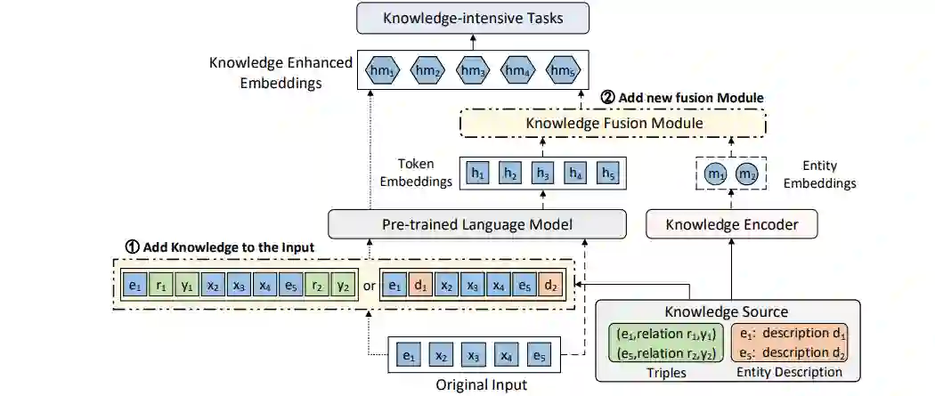 PLMs 显式地合并外部知识主要有三种方式:修改模型输入、添加知识融合模块和利用外部内存。前两种方法将相关知识插入PLMs中,其形式为模型的额外输入或模型中的额外组件,如图7①和②所示。第三种方法使文本空间和知识空间保持独立,从而便于知识更新