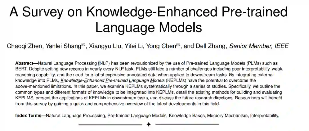 通过使用像BERT这样的预训练语言模型(PLMs),自然语言处理(NLP)已经发生了革命性的变化。尽管几乎在每个NLP任务中都创造了新记录,但PLM仍然面临许多挑战,包括可解释性差、推理能力弱,以及在应用于下游任务时需要大量昂贵的注释数据。通过将外部知识集成到PLM中,知识增强的预训练语言模型(KEPLMs)有可能克服上述限制。本文通过一系列研究对KEPLMs进行了系统的考察。具体地,概述了可集成到KEPLMs中的知识的常见类型和不同格式,详细介绍了现有的构建和评估KEPLMs的方法,介绍了KEPLMs在下游任务中的应用,并讨论了未来的研究方向。研究人员将从这项调研中受益,通过获得该领域最新发展的快速和全面的概述。