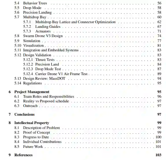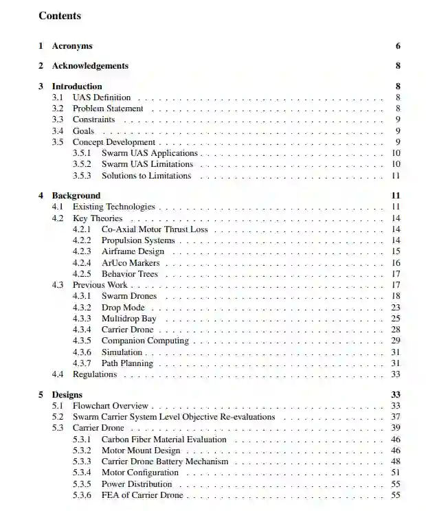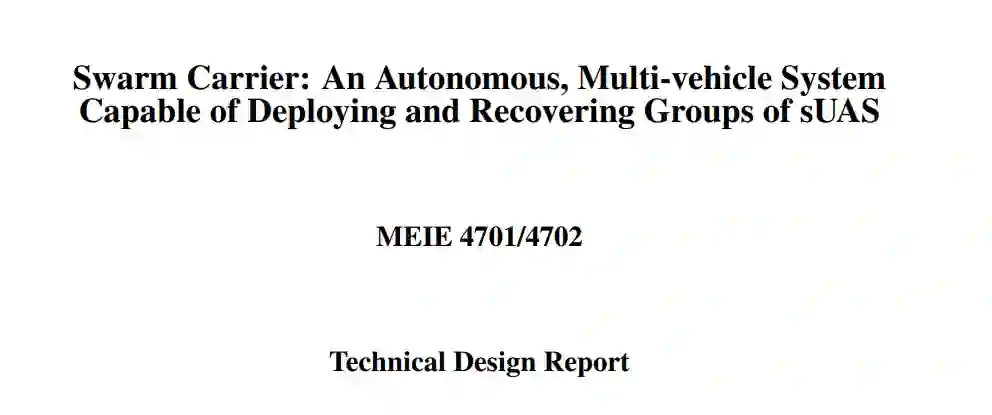 蜂群载体的目的是设计、制造和演示一个系统,从一个载体无人机系统(UAS)上部署和回收几个小型无人机系统(sUAS)。该项目开发的重点是实现由部署、回收和任务执行的全循环测试确定的系统级功能。硬件开发涉及UAS设计的有限元分析(FEA),系统验证测试,以及载体无人机、蜂群无人机和多货舱的设计迭代。软件开发将集中在行为树、自主着陆、投放模式和协作式蜂群控制。蜂群载体系统及其子组件的概念源于AerospaceNU的研究。在此基础上,具体开发将涉及最终的原型和集成,以及系统级的软件开发,以实现全面测试。