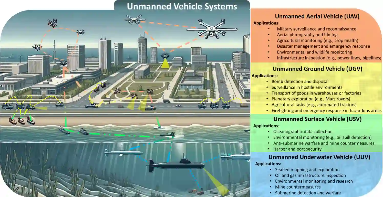 近年来,无人系统(UVs)已成为一种颠覆性技术,为日常生活的各个领域带来了革命性的变化,其应用范围从包裹递送、民用物联网(IoT)到军事用途[1, 2]。具体来说,无人车指的是可以在有限或无人干预的情况下运行的车辆、设备或机器,例如,车上没有人类驾驶员或机组人员。得益于这一特殊属性,UV 可用于在具有挑战性或危险的环境中执行任务。一般来说,无人系统可分为无人飞行器(UAV)、无人地面车辆(UGV)、无人水面航行器(USV)和无人水下航行器(UUV)。正如其名称所示,每种无人系统都是为特定任务和环境而设计的。例如,UAV 被广泛用于航拍、环境和野生动物监测以及监视 [3, 4],而 UGV 则可用于运输和炸弹探测等任务。不同的是,USV 和 UUV 分别用于水面和水下作业,包括海洋学数据收集、水下勘探和潜艇监视 [5,6]。