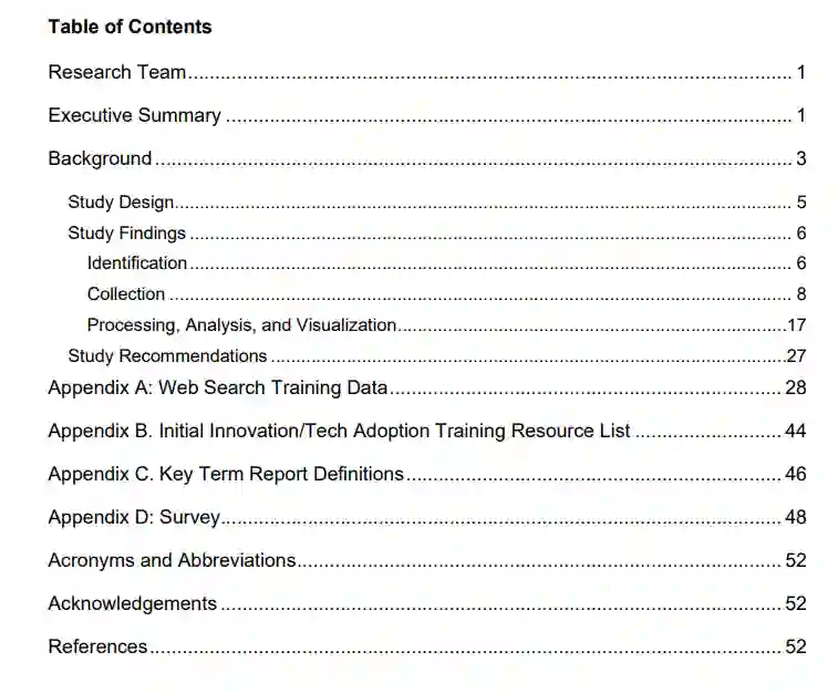 学术文献提出,创新是在一个以知识为中心的过程中,在多个系统中认识和实施 "创造价值的东西 "的努力。为了确保本报告与文献相一致,创新被定义为开发新的或明显改变的服务、产品、流程、结构或政策。基于额外的文献审查结果,该团队开发了一个研究框架,以确定和评估整个部门、学术界和工业界的创新和技术采用培训计划。研究小组采用了三部分数据收集方法:公开资料搜索、有针对性的访谈和调查。然后对以下分类变量进行了分析: 培训类型(DAU,美国防部,非政府),创新阶段(识别,获取,整合),功能区(DAU分类法),以及五类变化代理中的四类(创新者,促进者,领导者和用户)。然后,VT-ARC总结了这些数据,以确定与研究相关的课程中的潜在差距。