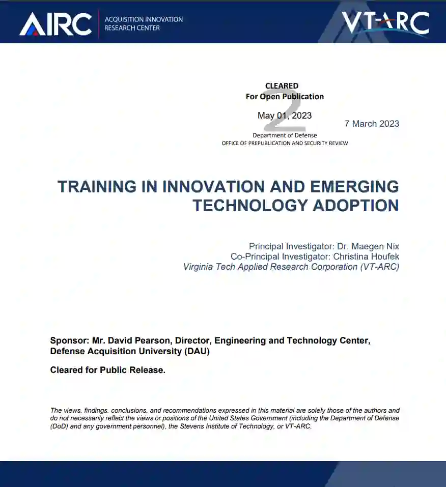 为响应国会任务,美国国防采购大学(DAU)通过美国防部赞助的大学附属研究中心--系统工程研究中心(SERC)与采购创新研究中心(AIRC)签订合同,就美国防部雇员(政府文职人员、承包商和现役人员)可获得的创新和新兴技术采用培训项目的现状进行研究和报告。来自弗吉尼亚理工大学应用研究公司(VT-ARC)的AIRC研究人员通过文献综述、访谈和调查,对该主题进行了全面审查。本报告在广泛研究的基础上,介绍了美国防部、学术界和工业界的创新和新兴技术采用培训计划的现状,同时具体阐述了国会要求的五个列举项目。