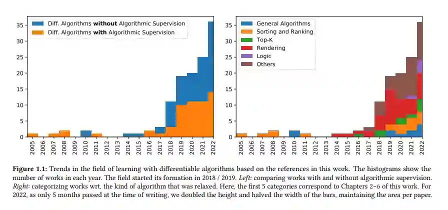 可微算法学习可以分为2个学科: I可微算法,即研究如何通过算法反向传播并获得有意义的梯度。I算法监督(Algorithmic Supervision),将算法知识融入到神经网络模型的训练中。可微算法学习是机器学习中一个相对较新的领域。具体来说,除了一些个人早期的作品外,可微算法和算法监督领域在2018年取得了进展。我们已经在图1.1的调查直方图中可视化了这一点。在这里,我们将所有关于可微算法的相关工作分为应用算法监督的和不应用算法监督的(左)。进一步,我们将它们分类为wrt。他们提出或应用的可微算法。我们注意到,作者在2018年提出并开始了可微算法的研究,即在该领域形成之初。我们还注意到,该领域正在发展,最近才看到对现实问题的直接应用。
