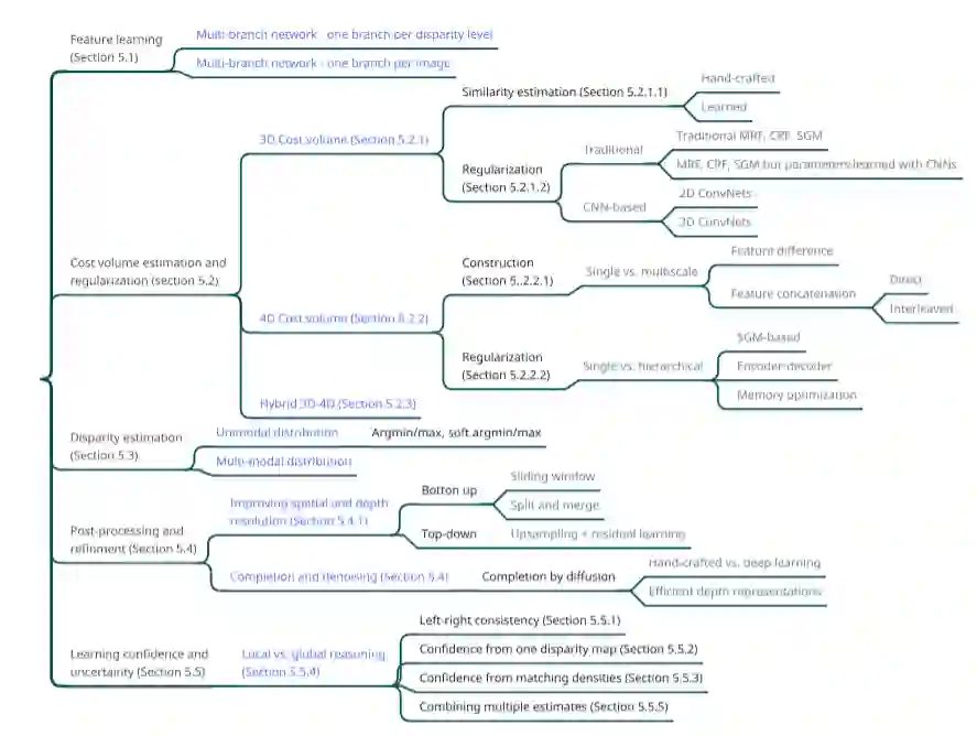 从RGB图像估算深度是一个长期存在的不适定问题,计算机视觉、图形学和机器学习领域已经对这个问题进行了数十年的研究。在现有的技术中,立体匹配仍然是文献中使用最广泛的技术之一,因为它与人类的双目系统有很强的联系。传统上,基于立体的深度估计是通过匹配多幅图像的手工特征来实现的。尽管进行了大量的研究,这些传统的技术仍然受到高度纹理区域、大的均匀区域和遮挡的影响。深度学习在解决各种2D和3D视觉问题上越来越成功,在此基础上,基于立体的深度估计引起了社区越来越多的兴趣,在2014年至2019年期间,该领域发表了150多篇论文。新一代的方法在性能上有了显著的飞跃,使自动驾驶和增强现实等应用成为可能。在本文中,我们对这一新的、不断增长的研究领域进行了全面的调研,总结了最常用的处理流程,并讨论了它们的优点和局限性。在回顾到目前为止所取得的成果的同时,我们也对基于深度学习的立体视觉在深度估计方面的研究前景进行了展望。