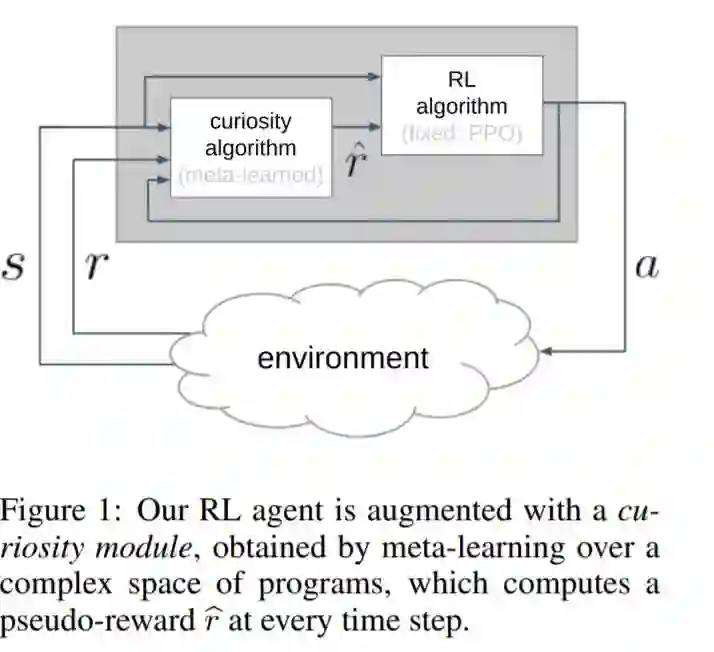 我们假设好奇心是进化过程中发现的一种机制,它鼓励个体在生命早期进行有意义的探索,从而使个体接触到能够在其一生中获得高回报的经历。我们将产生好奇行为的问题表述为元学习的问题之一:一个外环将在一个好奇心机制的空间中搜索,该机制动态地适应代理的奖励信号,而一个内环将使用适应的奖励信号执行标准的强化学习。然而,目前基于神经网络权值传递的meta-RL方法只在非常相似的任务之间进行了推广。为了扩展泛化,我们提出使用元学习算法:类似于ML论文中人类设计的代码片段。我们丰富的程序语言将神经网络与其他构建模块(如缓冲区、最近邻模块和自定义丢失函数)结合在一起。我们通过实验证明了该方法的有效性,发现了两种新的好奇心算法,它们在图像输入网格导航、acrobot、lunar lander、ant和hopper等不同领域的性能与人类设计的公开发布的好奇心算法相当,甚至更好。