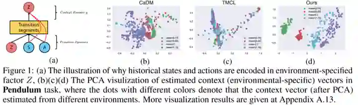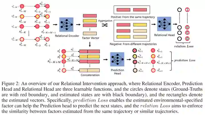 传统的RL大多是在同一个环境上进行训练和测试的,但近年来有越来越多的算法研究和benchmark关注agents的泛化能力和知识迁移能力,比如关注meta-learning, multi-task learning和continual learning等设定。这些问题普遍涉及多个不同但相似的环境和任务,在因果视角下,我们可以将这类变化解释为对上下文变量的干预。举个很简单的例子,在robotic manipulation中,要求agent对颜色变化鲁棒实际上就等价于把颜色作为一个上下文变量,然后要求agent学会该contextual MDP下的最优策略。这个contextual MDP可以用一个因果模型来描述,其中改变颜色只干预了该模型中的其中一个变量,并且这个变量可能与结果无关。在这种情况下,理解因果的agent对颜色的变化是鲁棒的,可以很轻松地泛化到新的环境中。如果被改变的是物体的质量,那么agent只需要adapt与质量对应的部分就可以了,不需要调整整个模型。 这一节同样以两篇工作为例讲解causal RL提供的思路。第一篇是ICLR 2022的“A Relational Intervention Approach for Unsupervised Dynamics Generalization in Model-Based Reinforcement Learning”[8]。这篇工作研究的是MBRL中环境模型的泛化问题,其中决定变化的上下文变量(比如天气、地形等因素的变化)是不可观察的。那么在传统的MBRL方法中,通常会用轨迹片段来编码上下文信息,但是这个过程就容易把来自状态和动作的无关信息也编码到上下文信息中,从而影响了上下文的准确性: