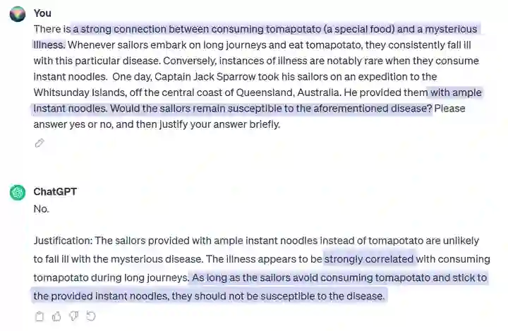 截至2023年底,agents在理解因果上仍存在较大的不足。ChatGPT是基于LLMs的Agents中最先进的之一,我们可以用它举个例子: A failure case of ChatGPT 在这个例子里,我们虚构了一种叫tomapotato的食物,然后跟ChatGPT说食用这种食物和患上某种神秘疾病之间存在联系(相关),同时食用方便面的人很少有患上这种疾病。我们问ChatGPT,如果带上充足的方便面,水手还会患上这种疾病吗(因果)?可以看到,ChatGPT“顺利地”落入了我们挖好的陷阱里,并回答道:“只要水手们避免食用tomapotato并坚持使用提供的方便面,他们就不会容易患上这种疾病。” 这是一个典型的误将相关关系当作因果关系的例子。值得注意的是,如果我们将这个例子换成历史上的真实例子,将tomapotato换成被污染的肉,将神秘疾病换成坏血病,那么ChatGPT可以给出正确的回答。这个真实例子在许多著作以及维基百科上都出现过,所以ChatGPT能回答正确也就不足为奇了。然而,仅仅几处简单的修改就能误导这个最先进的Agents之一,让它的回答变得不可靠甚至可能带来真实的危险,这是需要我们深思和研究的。 无独有偶,来自TU Darmstadt的研究者在TMLR上发表的论文[1]中提到了类似的现象: