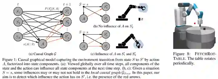 首先,我们知道样本效率太低是强化学习常常被诟病的一个原因。围绕如何提升样本效率而开展的研究工作已经非常多了,这里介绍两个与causal RL有关的工作。 第一篇工作是发表在NeurIPS 2021上的Causal Influence Detection for Improving Efficiency in Reinforcement Learning[6]。它考虑的是一个robotic manipulation问题: