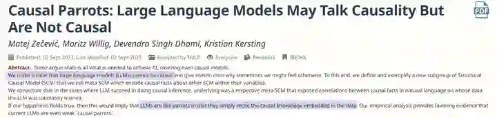 causal parrots. 作者将这种现象称为“Causal Parrots”。简单来说,这意味着这些最为强大的智能体,即便表现得很像人类,依然只是在重复着训练数据中已经存在的因果知识,没有真正地理解这些知识,就像学舌的鹦鹉一样。