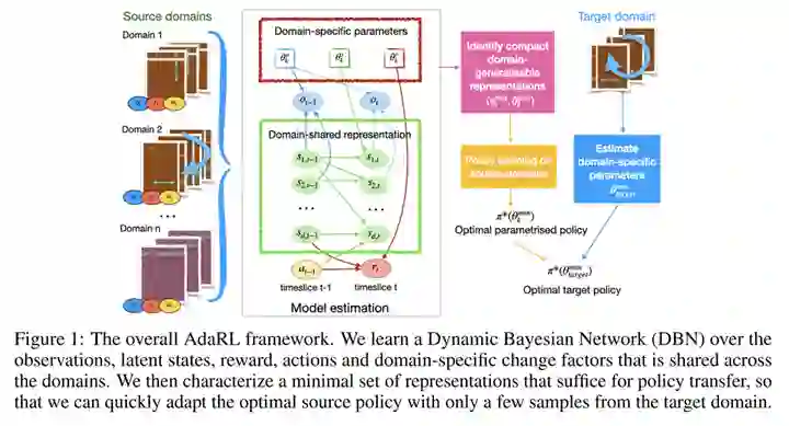 首先,学习模型肯定有一个prediction loss,通过当前状态S 、动作A 、以及上下文Z 来预测下一时刻的状态S′ 。此外,为了学习如何编码上下文,还需要一个relation loss。它的目标是使同一条轨迹或者同一环境产生的相似轨迹的上下文变量尽量一致。这里的难点在于如何判断轨迹是否来自同一环境。从因果的角度来看,在同一环境中,上下文变量对S′ 的因果效应应该是相近的,所以我们可以用这个因果效应来判断轨迹是否同属一个环境。进一步地,Z 到S′ 有多条因果路径,比如可以是Z→S→S′ 和Z→A→S′ 。作者认为这些间接路径容易受到噪声的影响,所以选择测量受控直接效应(controlled direct effect, CDE),也即仅通过Z→S′ 这条直接路径传递的因果效应 。实验表明这个方法不但能降低状态转移的预测误差,还能在新环境上取得很好的zero-shot泛化效果。从图1的PCA结果来看,这个方法学到的上下文变量很好地捕捉了环境的变化。 第二篇要介绍的工作同样发表在ICLR 2022上,标题是“AdaRL: What, Where, And How to Adapt in Transfer Reinforcement Learning”[9]。这篇论文关注的是强化学习中的迁移学习问题。具体来说,在训练的时候,agent可以access多个不同的source domains,然后测试的时候需要在只获取target domain的少量样本的情况下取得好的效果。论文提出了一个称为AdaRL的框架: