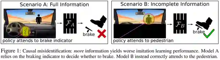 第一类称为混杂偏差,两个变量之间可能本来不存在因果关系,但是因为有一个不可观察的混杂变量同时影响这两个变量,所以它们会存在很强的关联。第二类称为选择性偏差,这种情况下两个变量之间的关联是在给定第三个变量时产生的。因果推断中分析和处理这两类问题的技术都很成熟,所以我们主要需要关心的是在强化学习的问题中存在哪些虚假相关。 这里通过发表在NeurIPS 2019的“Causal Confusion in Imitation Learning”[10]进一步讲解一下策略学习中的混杂偏差。直觉上,我们通常认为可用于决策的信息越丰富越好,一个模态不够要用多个,有的时候特征不够还要造特征。但这篇论文里提出了一个很有意思的说法 —— 拥有更多的信息并不总是更好的:
