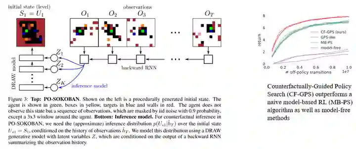 在强化学习中,状态空间通常被看成一个整体,但我们可以根据状态维度的物理意义对其进行拆分,使得每个部分对应一个实体,比如机械臂的end effector和桌子上的物体。对于这个任务来说,agent要取得成功就必须先与物体建立物理接触,只有这样它才有可能可以移动物体到指定的位置。从因果的角度来看,建立物理接触的本质就是看动作是否能在因果上影响到物体。因此,我们可以构造一个因果量用于测量动作对物体的因果效应,这在论文中被称为causal influence。基于causal influence,我们可以指导agent如何更有效地探索环境 —— 优先探索可以与物体建立物理接触的区域,从而提高样本效率。这个方案简单有效,很好地避免了agent在庞大的状态-动作空间中进行无意义的探索(比如:随机地在空中挥舞机械臂)。 第二篇工作是DeepMind在ICLR 2019上发表的,叫做“Woulda, Coulda, Shoulda: Counterfactually-Guided Policy Search”[7]。它考虑的是一个episodic POMDP问题: