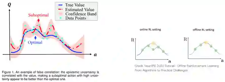 由于样本集的大小是有限的,所以一些次优动作的结果可能是“虚高”的。如果agent不考虑认知不确定性带来的虚假相关,那它就会受到这些次优动作的影响,从而无法习得最优的策略。详细的讲解可以参考专栏里的文章:Zhihong Deng:一篇顶刊论文背后的故事 | TPAMI (2023) 用于离线强化学习的伪相关削减术https://zhuanlan.zhihu.com/p/665683090