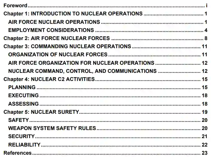 美国空军(USAF)的核作战是其防御态势的重要组成部分。核作战的严肃性源于核战争的灾难性后果,这要求对安全、安保和严格遵守规程做出坚定不移的承诺。空军的核事业建立在周密规划、严格训练和持续警惕的基础之上,以确保以应有的尊重和谨慎态度处理核武器的强大威力。核作战的独特性源于武器系统本身的技术复杂性,以及支撑其运用的复杂地缘政治和战略考量。核威慑作为国家安全政策的基石,依赖于可信的核报复威胁来慑止侵略,这使得美空军的核能力成为其威慑态势的关键组成部分。可信的核威慑对于在不使用核武器的情况下维护国家安全、防止威胁至关重要。由于核作战具有同时在战略、战役和战术层面达成效果的潜力,核作战的实施受到严格控制,以确保运用所有国家力量工具的统一努力。使用核武器的决定是一项政治决策,由国家领导层做出以支持国家目标。它也可能导致意外后果,例如局势升级或与其他国家关系的长期恶化。因此,执行核作战的决定需要考虑核武器产生的重大物理、政治和心理影响。本条令是理解美国空军核作战的基础性资源,为空军人员提供了全面的行动框架。