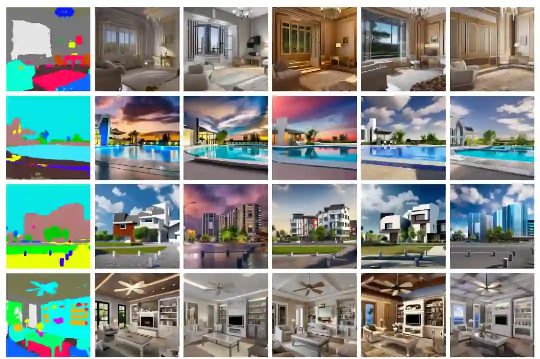 语义分割(ADE20K)。由BLIP对ADE20K数据集生成caption,获得了164K分割-图像-caption数据对。该模型在Nvidia A100 80G上使用200个gpu小时进行训练。基础模型是Stable Diffusion 1.5。
