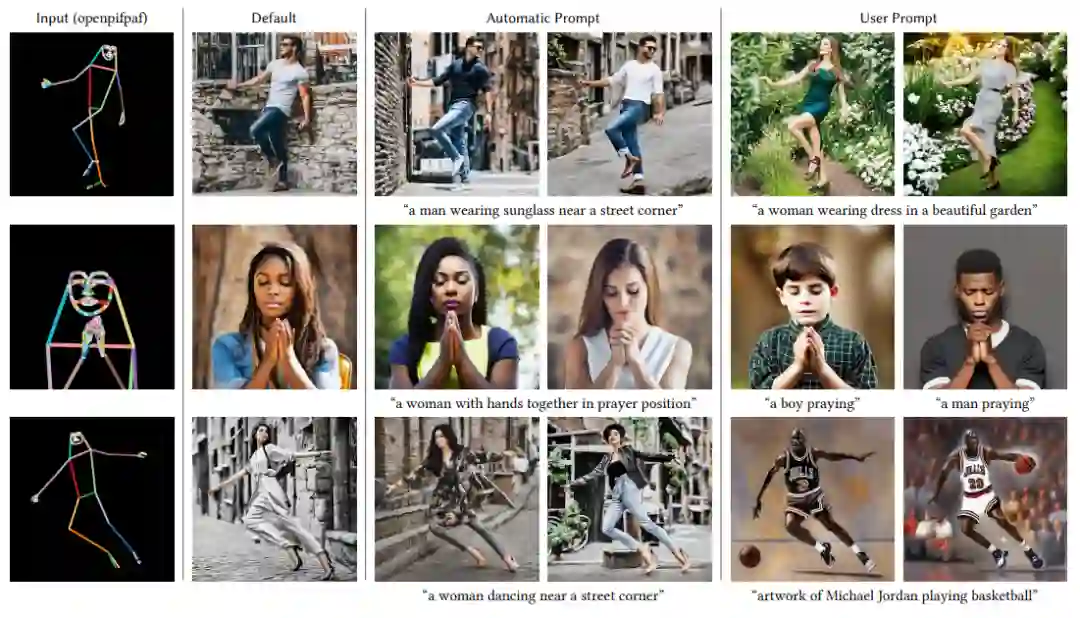 人体姿势(Openpifpaf)。使用基于学习的姿势估计方法来从互联网上“找到”人类,使用一个简单的规则:含有人类的图像必须有至少30%的全身关键点被检测到。获得了80k个姿势-图像-caption数据对。请注意,直接使用人体骨骼的可视化姿态图像作为训练条件。在Nvidia RTX 3090TI上使用400个gpu小时进行训练。基础模型是Stable Diffusion 1.5。