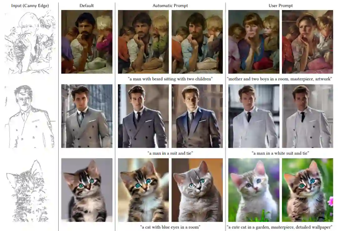 由于原始权重是锁定的,因此在训练时不需要对原始编码器进行梯度计算,可以加快训练速度并节省 GPU 内存。具体来说,使用 ControlNet 创建 12 个编码块和 1 个中间块的可训练副本。输出被连接到 U-net 的 12 个解码块和 1 个中间块中。 设置中,采样器为DDIM。默认使用20个步骤,三种类型的prompt来测试模型: (1)No prompt:使用空字符串“”作为prompt。 (2)Default prompt:由于Stable diffusion本质上是用prompt训练的,空字符串可能是模型的一个意外输入,如果没有提供prompt,SD倾向于生成随机纹理。更好的设置是使用无意义的prompt,如“一张图片”、“一张漂亮的图片”、“一张专业的图片”等。在设置中,使用“专业、详细、高质量的图像”作为默认prompt。 (3)Automatic prompt:为了测试全自动流程最好的效果,还使用自动图像caption方法(如BLIP)。使用“Default prompt”模式获得的结果生成prompt,再次使用生成的prompt进行扩散生成。 (4)User prompt:用户给出prompt。