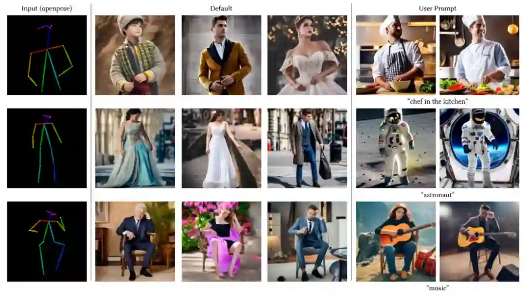 人体姿势(Openpose)。使用基于学习的姿态估计方法在上面的Openpifpaf设置中使用相同的规则从互联网上找到人类。获得了200k个姿势-图像-caption数据对。直接使用人体骨骼的可视化姿态图像作为训练条件。使用Nvidia A100 80G进行300个gpu小时的训练,其他设置与上面的Openpifpaf相同。