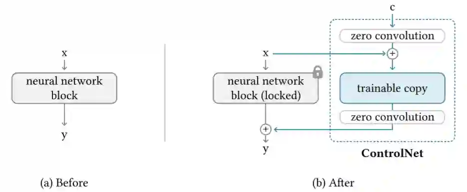 将 中的所有参数锁定,并克隆一个可训练的副本 ,用外部条件 训练副本 。将原始参数和新参数分别称为"锁定副本"和"可训练副本"。这样可以在数据集较小时避免过拟合,并且保持从数十亿张图像中学习到的大型模型的质量。神经网络块由一种称为“零卷积”的独特类型的卷积层连接,即权重和偏置都以零初始化的 卷积层,零卷积操作表示为 。由此,ControlNet 的结构可以表示为