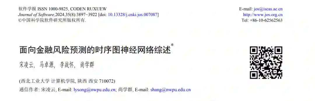 金融风险预测在金融市场监管和金融投资中扮演重要角色, 近年来已成为人工智能和金融科技领域的热 门研究主题. 由于金融事件的实体之间存在复杂的投资、供应等关系, 现有的金融风险预测研究常利用各种静态 和动态的图结构来建模金融实体间的关系, 并通过卷积图神经网络等方法将相关的图结构信息嵌入金融实体的特 征表示中, 使其能够同时表征金融风险相关的语义和结构信息. 然而, 以前的金融风险预测综述仅关注了基于静态 图结构的研究, 这些研究忽视了金融事件中实体间关系会随时间动态变化的特性, 降低了风险预测结果的准确性. 随着时序图神经网络的发展, 越来越多的研究开始关注基于动态图结构的金融风险预测, 对这些研究进行系统、 全面的回顾有助于学习者构建面向金融风险预测研究的完整认知. 根据从动态图中提取时序信息的不同途径, 首 先综述 3 类不同的时序图神经网络模型. 然后, 根据不同的图学习任务, 分类介绍股价趋势风险预测, 贷款违约风 险预测, 欺诈交易风险预测, 以及洗钱和逃税风险预测共 4 个领域的金融风险预测研究. 最后, 总结现有时序图神 经网络模型在金融风险预测方面遇到的难题和挑战, 并展望未来研究的潜在方向. 关键词: 时序图神经网络; 金融风险预测; 股价趋势风险; 贷款违约风险; 欺诈交易风险; 洗钱和逃税风险