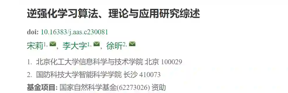 随着深度强化学习的研究与发展, 强化学习在博弈与优化决策、智能驾驶等现实问题中的应用也取得显著进展. 然而强化学习在智能体与环境的交互中存在人工设计奖励函数难的问题, 因此研究者提出了逆强化学习这一研究方向. 如何从专家演示中学习奖励函数和进行策略优化是一个新颖且重要的研究课题, 在人工智能领域具有十分重要的研究意义. 本文综合介绍了逆强化学习算法的最新进展, 首先介绍了逆强化学习在理论方面的新进展, 然后分析了逆强化学习面临的挑战以及未来的发展趋势, 最后讨论了逆强化学习的应用进展和应用前景.