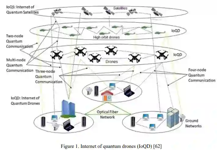 无人机的出现已对军事战争产生重大影响,提供了改进的侦察、监视与目标获取(RSTA)能力,实现了成本节约,并提升了便利性、安全性与灵活性。一种被称为无人机互联网(IoD)的分层网络控制架构,协调无人机进入受控空域并提供导航服务。包括无线传感器网络(WSN)和可导向扩展控制区的无人机在内的各种系统,与IoD集成以提升连接性能。本文概述了IoD和量子无人机互联网(IoQD),重点阐述了其应用与部署中的关键问题及潜在解决方案。IoQD提供了诸如安全消息交换、快速通信过程、创建和部署私有IoQD的可行性,以及启用一个新的应用领域——量子阱(QW)等主要特性。总而言之,无人机技术的出现已显著改善了军事行动的诸多方面,包括侦察、监视与目标获取。IoQD为军事网络提供了一个有前景的解决方案,它促进了数据的安全快速传输,并最终使整个军事网络受益。