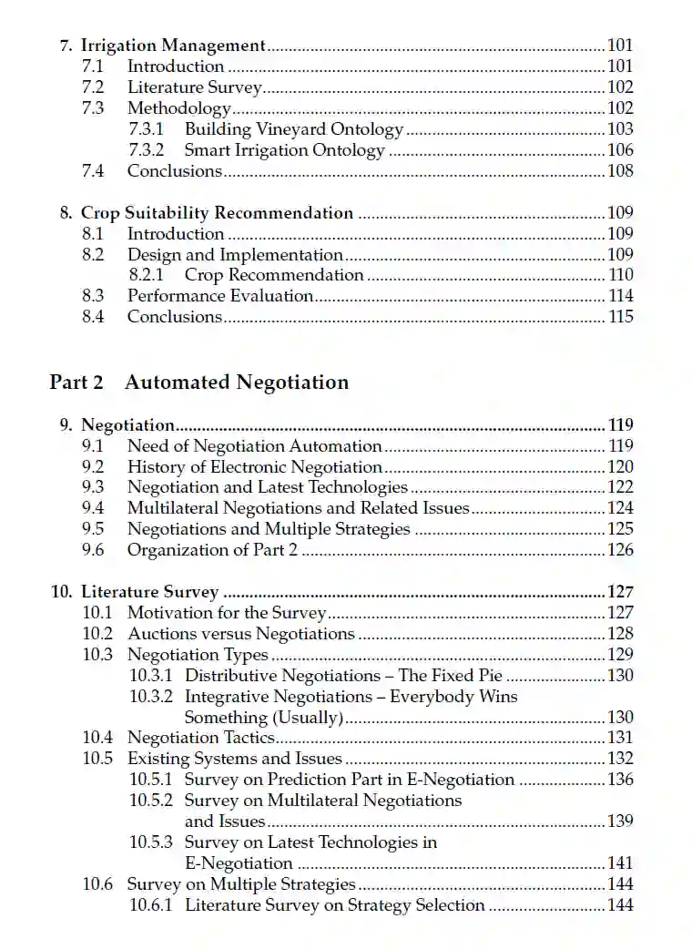 介绍了基于本体论的综合农作物管理决策支持系统的设计与开发。 讨论了将文本形式的农业知识转换为本体论的技术。 侧重于对各种电子谈判协议进行广泛研究,以进行自动化谈判。 提供了一个用于预测对手行为和影响谈判过程的各种因素的架构。 本文主要面向计算机科学与工程、农业科学和信息技术领域的研究生、专业人士和学术研究人员编写。