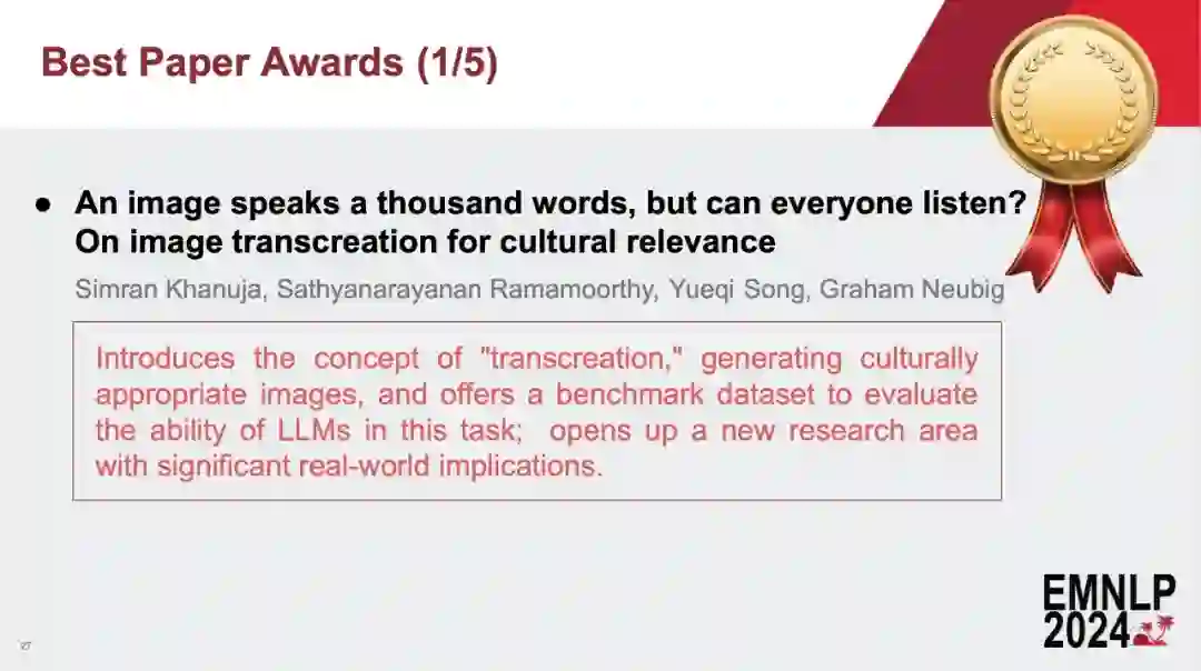 获奖理由:解决了翻译与文化相关的命名实体的挑战,挑战了以前关于如何翻译命名实体的观点。