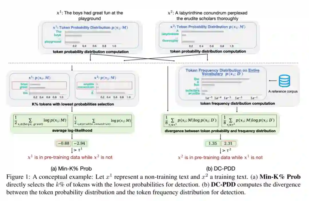 摘要:随着大型语言模型(LLM)训练语料库规模的扩大,模型开发者越来越不愿意公开其数据的详细信息。这种缺乏透明度的情况给科学评估和道德部署带来了挑战。最近,人们开始探索预训练数据检测方法,这类方法会通过黑盒访问推断给定文本是否是 LLM 训练数据的一部分。Min-K% Prob 方法已经取得了最先进的成果,该方法假定非训练样本往往包含一些 token 概率较低的离群词。然而,这种方法的有效性可能有限,因为它往往会误分那些包含许多由 LLM 预测为高概率的常用词的非训练文本。本文受散度随机性的启发,引入了一种基于散度的校准方法,来校准用于预训练数据检测的 token 概率。研究者计算了 token 概率分布和 token 频率分布之间的交叉熵(即散度),从而得出检测得分。此外还开发了一个中文基准 —PatentMIA,以评估 LLMs 检测方法在中文文本上的性能。在英文基准和 PatentMIA 上的实验结果表明,本文提出的方法明显优于现有方法。