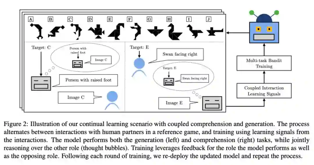 摘要:同时具备语言理解和生成能力的系统可以从两者之间的紧密联系中获益。本文将理解和生成功能结合在一起,重点关注从与用户的互动中不断学习,提出了将这两种学习和推理能力紧密结合的技术。研究者将研究置于双人参考游戏中,并在与人类用户的数千次互动中部署各种模型,同时从互动反馈信号中学习。结果发现,随着时间的推移,性能有了显著提高,与无耦合系统相比,理解力生成耦合的绝对性能提高了 26%,准确率提高了 17%。本文分析还表明,耦合对系统语言的质量产生了重大影响,使其明显更像人类语言。