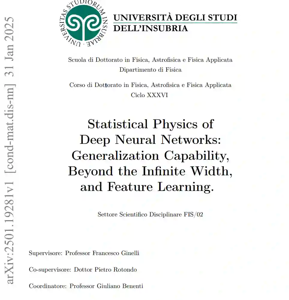 深度神经网络(DNNs)处于技术革命的前沿,展现出在各种任务中与人类专家相匹配甚至超越的能力。从图像识别到复杂的决策过程,DNNs正在重塑各个行业和科学研究。尽管它们广泛应用,但这些算法的内部机制仍然 largely 不透明,常被比作“黑箱”。尽管我们可以通过实验方法提升其性能,但深入全面地理解其内部过程依然是一个巨大的挑战。 对于统计力学领域而言,处理计算机科学问题并非新挑战。本论文正处于这一交叉点,采用跨学科的方法,利用基于物理学的方法深入理解DNNs。 本论文的核心通过三种不同但相互关联的研究方法展开。第一种方法是基于数据平均的,我们用它来建立DNNs泛化性能的渐近界限。这个结果不仅大大改善了统计学习理论中的经典界限,还展示了物理学视角如何超越传统的分析限制。值得注意的是,我们的结果只依赖于最后一层的大小,而不是网络参数的总数,突显了在深度网络中,信息是如何通过不同层进行不同方式处理的。 第二种方法则采取数据依赖的视角,聚焦于DNNs在已知的无限宽度极限之外的特定热力学极限下的行为。这一研究路线涉及对网络前向动态的详细分析,使我们能够对这些算法在现实环境中——即大多数实际DNNs运行的领域——的内部运作提供更加精确的统计描述。此项进展使我们能够得到:(i)在有限宽度单隐层网络中与回归任务相关的泛化误差的封闭公式;(ii)深度架构的分配函数的近似表达式;(iii)热力学极限下的深度神经网络与学生t过程之间的联系。 最后,论文采用了任务明确的方法,进行(初步)研究,探讨DNNs如何与简单且受控数据集的结构进行交互与适应。该分析旨在判断DNNs是否真能与数据集的结构产生共鸣,形成其特征的内部表示,而不仅仅是记住它。这一部分的研究对于理解DNNs何时被迫学习数据结构,而不是仅仅记住它,可能具有重要意义。 总之,本论文希望成为探索现代技术最令人着迷和影响深远领域之一的旅程。借助统计物理与机器学习之间的富有成效的对话,本文希望为揭示深度神经网络的内在行为做出贡献。这一研究方向,作为本论文的一小部分,具有潜力不仅能影响深度神经网络领域,还能够影响这些系统应用的无数领域,希望为更具可解释性和透明度的人工智能铺平道路。