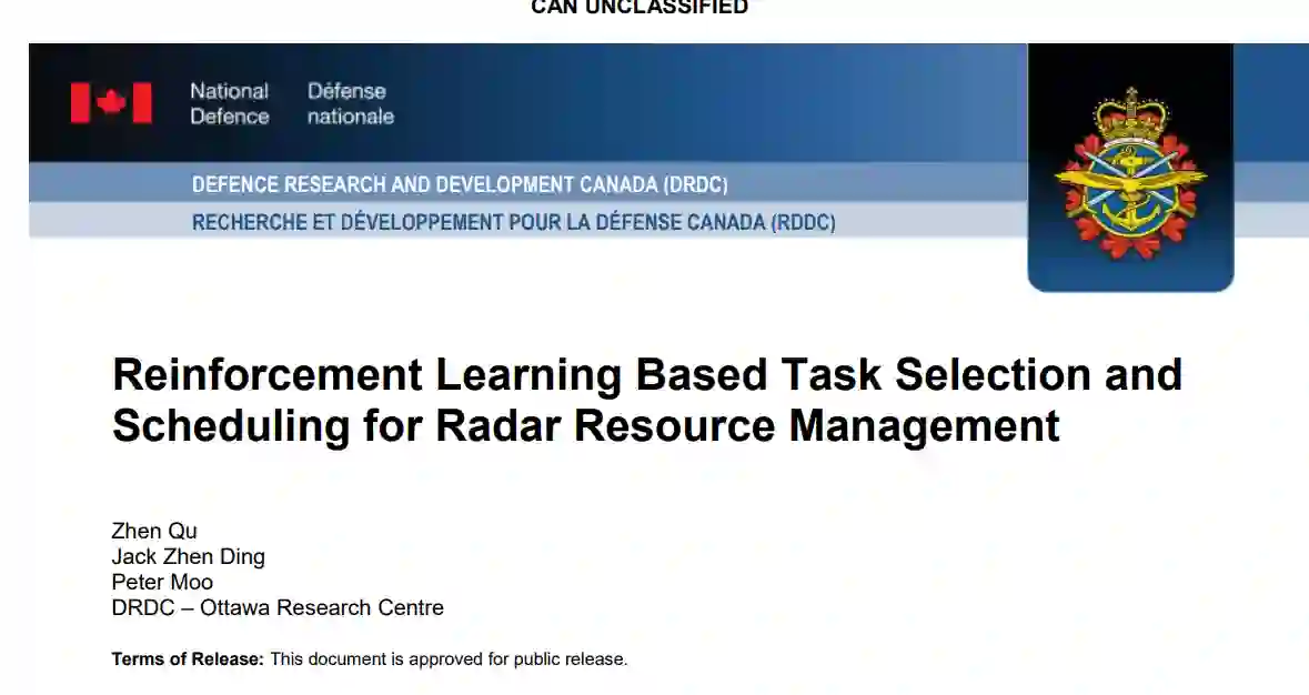 雷达资源管理(RRM)对于优化作为飞机、舰船和陆地平台主要传感器的现代相控阵雷达的性能至关重要。报告》讨论了雷达资源管理,包括任务选择和任务调度。该课题对国防科技(S&T)非常重要,因为它与现代相控阵雷达的大多数应用相关。它对当前的海军雷达项目尤为重要,该项目探索了雷达波束控制的人工智能(AI)/机器学习(ML)方法。所提出的算法有可能升级未来的舰船雷达,从而做出更好的决策并提高性能。