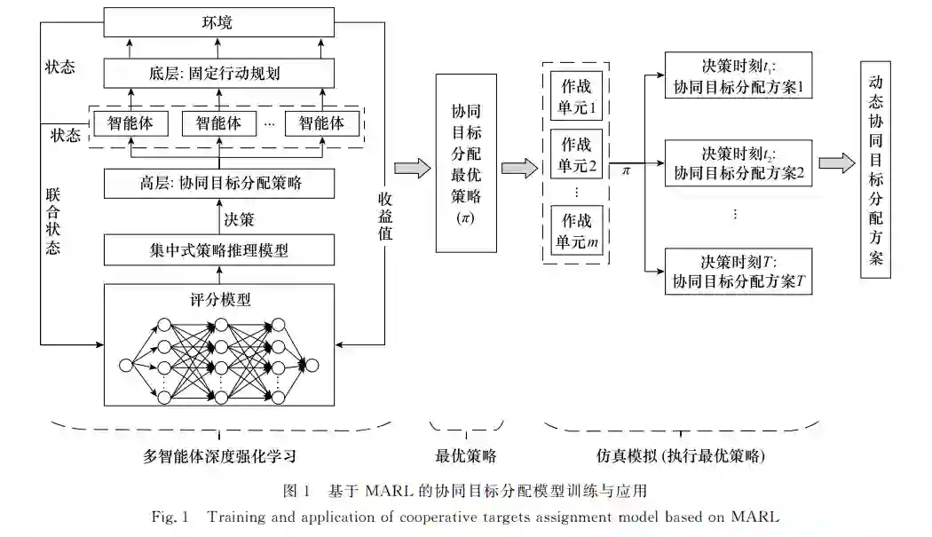 在分布式作战自同步理论中[17], 协同关系体现为作战单元“自底向上组织复杂战争的行为”。将作战单元构建为智能体, 协同目标分配问题便转化为多智能体协作(multi-agent cooperation, MAC)问题, 多智能体强化学习(multi-agent reinforcement learning, MARL)[18]在解决类似协作问题上有着广泛应用[19-23]。据此, 通过分析协同目标分配的军事内涵, 构建了基于MARL的协同目标分配模型, 采用局部策略评分和集中式策略推理, 利用Advantage Actor-Critic算法进行策略学习, 以期能够实现简单场景中训练好的模型直接泛化应用到复杂场景, 从而有效实现大规模目标分配。