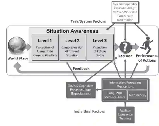 无人飞行器(UAV)作为多领域关键工具,凭借在危险/不可达环境作业能力及高性价比优势实现广泛应用。军事领域,无人机通过实时情报与态势感知能力,在监视侦察与战术行动中降低人员风险并提升任务效能;民用场景涵盖灾害响应、农业监测、基建检查及物流配送;搜救行动中无人机可快速覆盖广域复杂地形,显著提升受困者定位与救援概率(Arjomandi等, 2006)。态势感知作为无人机作业核心能力,包含感知(识别环境要素)、理解(解析要素关联与意义)、预测(预判态势演变)三级认知架构(Endsley, 1995, 1999),确保无人机安全高效达成作战目标。