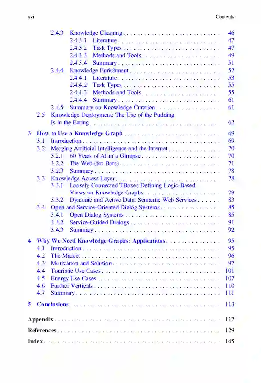 第一章定义了知识图谱,侧重于各种方法的影响,而不是数学精度。第2章详细介绍了知识图谱是如何构建、实现、维护和部署的。然后第3章介绍了可以构建在这些知识图谱之上的相关应用程序层,并解释了如何使用推理来定义这些图上的视图,使其成为开放和面向服务的对话系统的有用资源。第四章讨论了知识图谱技术在电子旅游中的应用以及在其他行业中的用例。最后,第五章对全文进行了总结,并提出了今后的工作方向。附加附录介绍了用于使schema.org适应特定领域和任务的领域规范的抽象语法和语义。