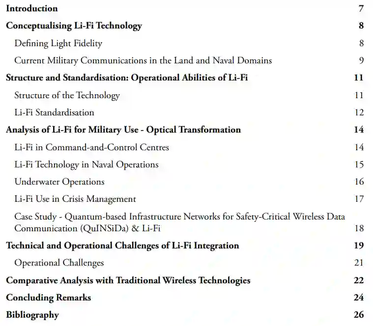 研究首先全面概述Li-Fi技术的优势与架构,继而探讨其标准化进程和大规模部署的成熟度。后续章节聚焦Li-Fi在军事指挥中心、海军舰队和灾害管理场景中的变革潜力,展示其在射频系统失效环境下仍能安全高效运行的独特能力。本文亦客观分析Li-Fi的局限性(如依赖视距通信和环境敏感性),同时提出混合解决方案与未来技术发展路径以克服这些障碍。