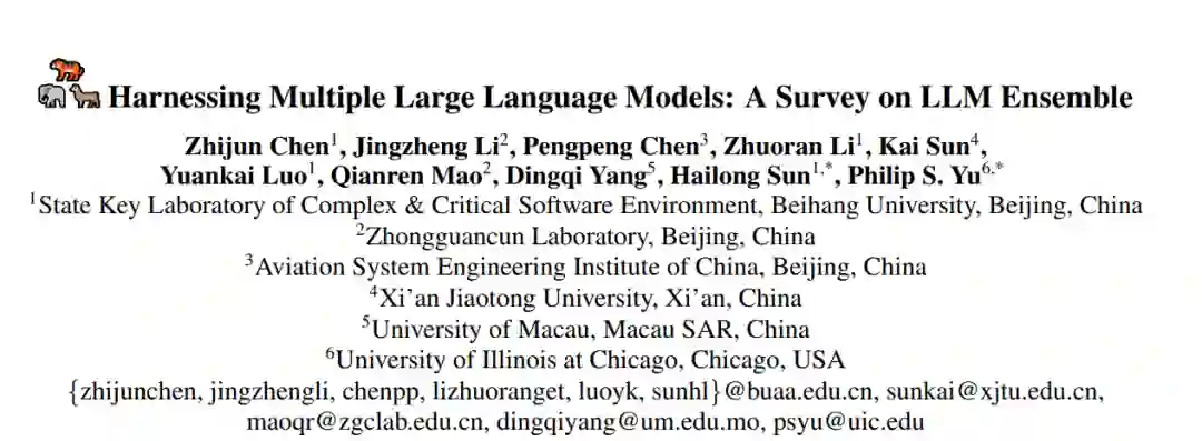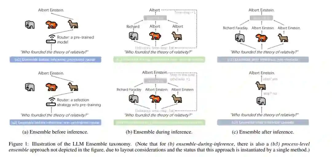 LLM集成——即全面利用多个大型语言模型(LLM),每个模型旨在处理下游推理中的用户查询,从而发挥其各自的优势——近年来已获得了广泛关注。大型语言模型的广泛可用性,以及它们各自的优势和开箱即用的特性,深刻推动了LLM集成领域的发展。本文首次系统性地回顾了LLM集成领域的最新进展。首先,我们介绍了LLM集成的分类法,并讨论了几个相关的研究问题。接着,我们根据‘推理前集成、推理中集成、推理后集成’的广泛分类,对各种方法进行了更深入的分类,并回顾了所有相关方法。最后,我们介绍了相关的基准测试和应用,总结了现有的研究成果,并提出了若干未来的研究方向。关于LLM集成的文献汇总列表,请访问 https://github.com/junchenzhi/Awesome-LLM-Ensemble。1 引言近年来,人工智能领域的格局因大型语言模型(LLM)的发展而发生了剧变,代表性的模型包括Gemini [Team et al., 2023]、GPT-4 [Achiam et al., 2023]、Llama [Touvron et al., 2023],以及最近推出的DeepSeek [Liu et al., 2024a]。这些LLM的成功继续激发广泛的研究热情,目前Hugging Face库中已可访问超过182,000个大型语言模型。 然而,在这股研究热潮背后,我们可以识别出两个主要方面: 1) 性能问题:LLM的直接开箱即用能力(零样本推理)和间接开箱即用能力(上下文学习的少样本推理)仍然引发性能担忧,包括准确性、幻觉和与人类意图的不对齐等问题; 2) LLM的优缺点差异及其推理成本:由于架构、参数大小、分词方法、词典、训练数据和方法论的差异,这些LLM表现出显著的变异性,其响应可能存在较大差异。考虑到上述两个方面,并借鉴集成学习的精神,自然地可以考虑,对于每个任务查询,与其在公共排名或其他标准的基础上持续依赖单一LLM,不如同时考虑多个LLM候选模型(可以开箱即用),并利用它们各自的优势。这正是新兴的LLM集成领域所探索的内容。现有的LLM集成方法大体可以根据LLM推理和集成的顺序分为三种类型: 1) 推理前集成方法:利用给定的查询信息,并考虑所有LLM候选模型的不同特性,以便为推理选择合适的模型(此方法类似于集成学习中的硬投票策略); 2) 推理中集成方法:在解码过程中,聚合来自多个LLM的不完整响应(例如,令牌级信息),并将组合结果反馈给所有模型; 3) 推理后集成方法:在所有模型或其子集生成完整响应(而非片段)后进行集成。尽管最近基于这些广泛范式衍生出了众多方法,但目前仍缺乏一篇正式的综述,提供对快速发展的LLM集成领域的核心思想和相关研究的全面回顾。本文呈现了首个关于LLM集成的全面综述,介绍了最新进展,并重点讨论了分类法、相关问题、方法、基准、应用和未来方向。我们希望这篇综述能够为研究人员提供全面的回顾,并激发进一步的探索。