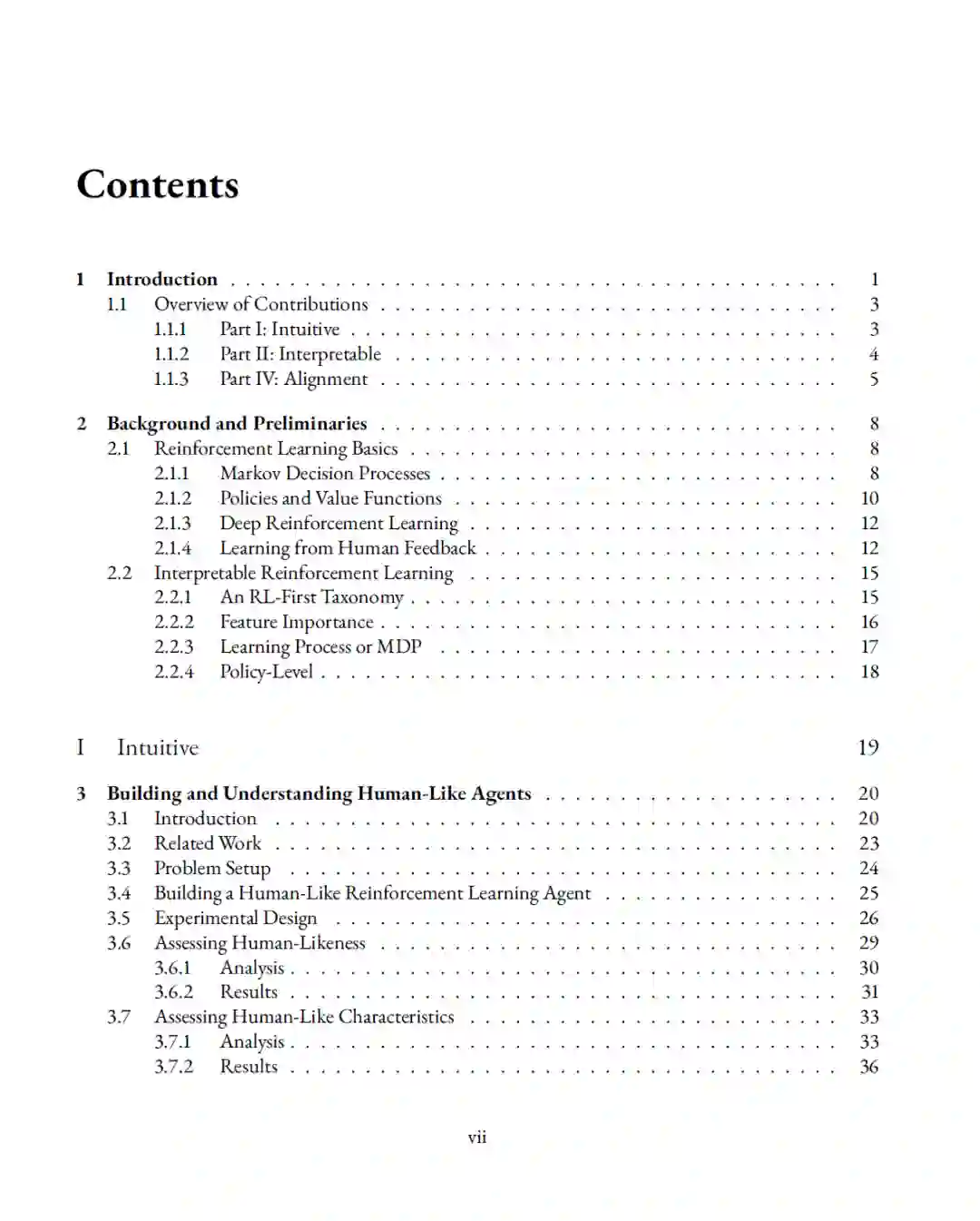 为实现直观行为,我们设计了第一个通过导航图灵测试(navigation Turing test)的 RL 智能体,并研究了人们为何将其行为视为“类人”的原因。为实现可解释性,我们提出并实现了针对 RL 的两种新维度的可解释性算法:在多智能体决策中保持透明性,以及减少对人工标注的依赖。围绕行为一致性,我们提出了一种新的对齐问题表述(基于决策的对齐),并引入了一种能够学习与人类偏好一致的决策策略的算法。同时,我们贡献了用于训练和评估智能体在模糊、不完全指定任务下行为一致性的基准与数据集。 最后,本论文讨论了未来研究如何在此基础上进一步推进,以实现能够支持人类繁荣发展的 AI 智能体。