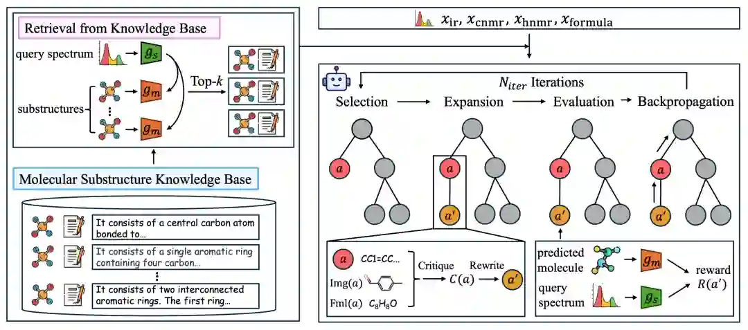 K-MSE框架将知识库和评分器整合到基于蒙特卡洛树搜索(MCTS)的推理框架中。在推理过程中,首先从知识库中使用分子-光谱评分器检索与查询光谱最相关的子结构及其描述,然后通过MCTS进行迭代推理。每次迭代包括选择、扩展、评估和回溯四个关键步骤: