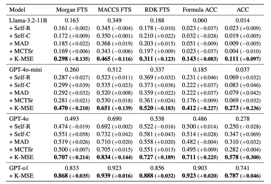实验在MolPuzzle数据集上进行,输入包括IR、C-NMR、H-NMR和分子式,目标是以零样本的方式预测分子的SMILES表示。实验选择了Llama-3.2-11B-Vision-Instruct、GPT-4o-mini、GPT-4o和GPT-o1作为基础模型。实验结果显示,K-MSE方法在所有基础模型上均优于基线方法,特别是在GPT-4o-mini和GPT-4o上,ACC分别提高了0.236和0.300。