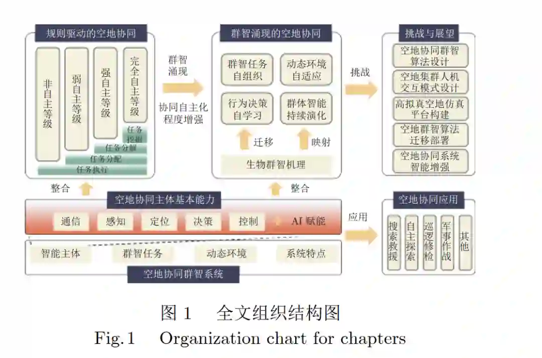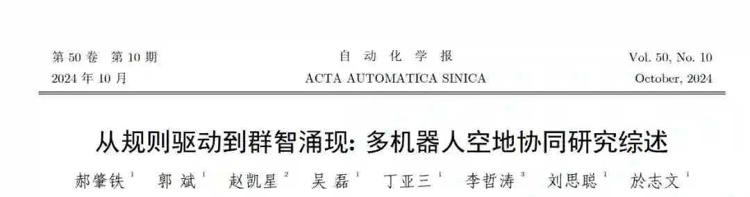 摘要: 多机器人空地协同系统作为一种在搜索救援、自主探索等领域具有广泛应用前景的异构机器人协作系统, 近年来受到研究者的高度关注. 针对限制空地协同系统自治性能的低智能性、弱自主性挑战, 如何增强个体智能、提高群体协同自主性是加快空地系统应用落地亟需解决的关键问题. 近年来, 随着以深度学习、群体智能为代表的人工智能(Artificial intelligence, AI)算法在感知、决策等领域的不断发展, 将其应用于空地协同系统成为了当前的研究热点. 基于空地协同的自主化程度, 总结从规则驱动到群智涌现不同协作水平下的空地协同工作, 强调通过增强个体智能涌现群体智慧. 同时, 构建并拓宽空地协同群智系统的概念及要素, 阐述其自组织、自适应、自学习与持续演化的群智特性. 最后, 通过列举空地协同代表性应用场景, 总结空地协同所面临的挑战, 并展望未来方向.