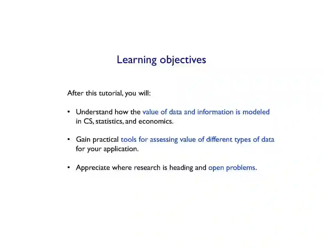 本教程的目标是让你了解最近关于数据价值的研究,从统计学和经济学的角度,如何有效地为数据或信息定价,以及如何从经济代理人那里收集数据。对于每个方面,我们将描述基本概念、当前状态或关键结果,以及开放问题。