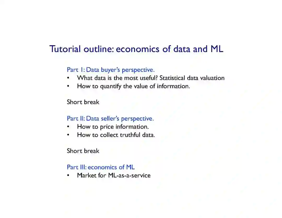 在简要介绍之后,本教程分为三个部分,分别从该领域的三个关键利益相关者的角度进行介绍:数据买家,数据卖家和ML供应商。第一部分站在数据购买者的角度,涵盖了数据价值建模的统计方法和经济方法。第二部分从数据卖家的角度出发,讨论了最近关于如何给数据定价以及如何通过汇总人群信息来收集数据的工作。最后,讨论了ML供应商的市场和竞争。