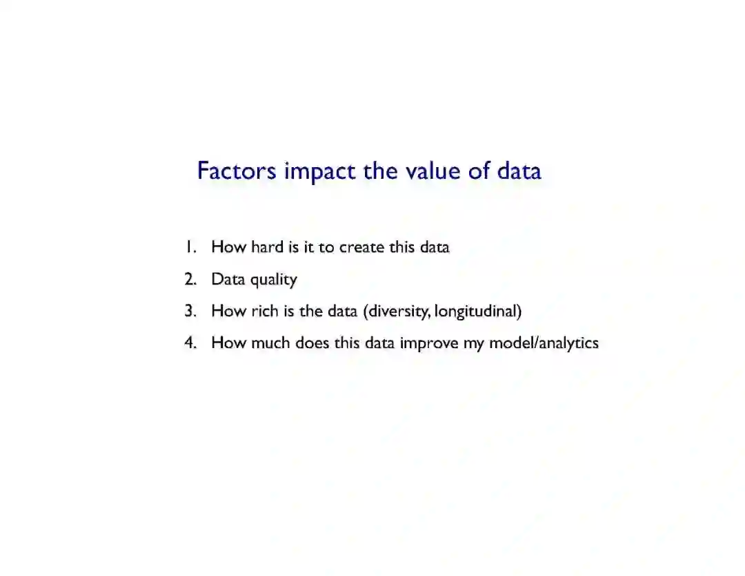 过去的十年见证了大型机器学习(ML)模型的巨大成功。对海量数据的访问在这一成功中发挥了关键作用。俗话说,“数据是新石油”,它为ML引擎提供动力。因此,在关键行业,如IT、金融、生物医学等,生成、购买或销售数据的竞争成为日益增长的趋势。然而,与开发数据驱动的机器学习模型的广泛研究相比,对数据本身的研究——例如,如何获取、评估、交换和价格数据——却很少被探索,事实上,最近才开始。原则性地理解数据本身对于促进数据的创建、填充和使用至关重要。