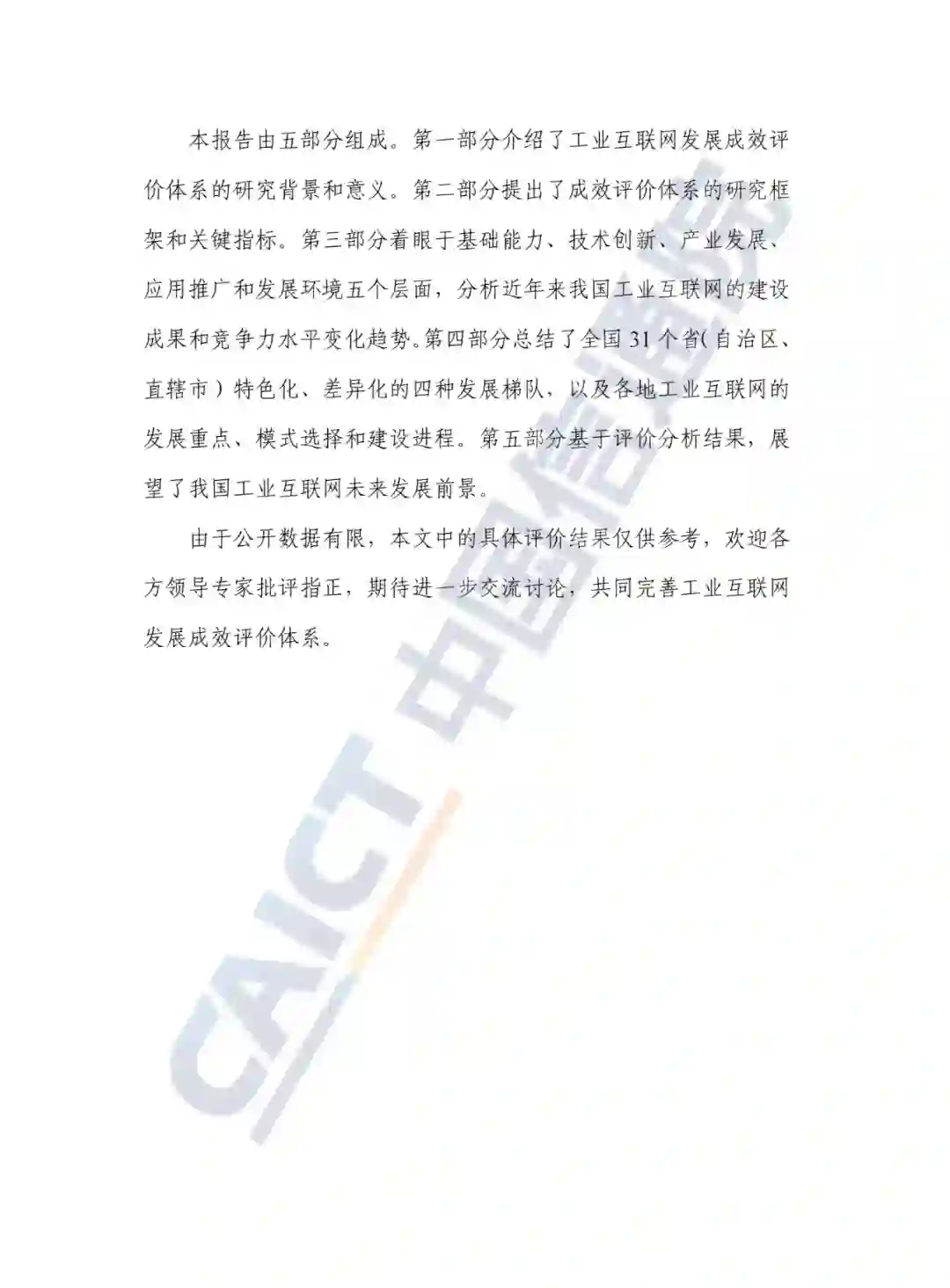 二、评估体系与指标 本报告构建了一套工业互联网发展成效评价体系,包含基础能力、技术创新、产业发展、应用推广、发展环境五个维度,每个维度下设有若干具体指标。通过综合评估,全面反映了中国工业互联网的发展状况。